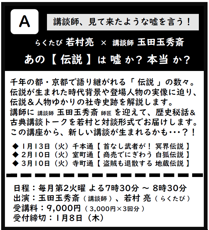 | 行程 | ◆1月13日(火)千本通【 首なし武者が! 冥界伝説 】 ◆ 2月10日(火)室町通【 商売でにぎわう 白狐伝説 】 ◆ 3月10日(火)寺町通【 盗賊も退散する 地蔵伝説 】 |