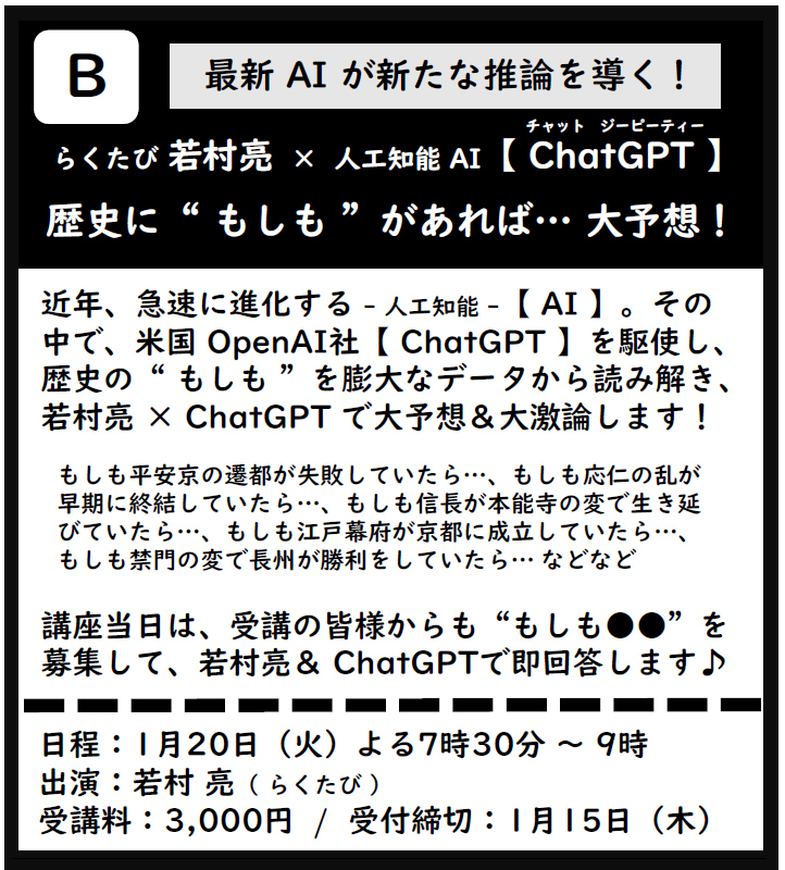 【オンライン講座】B≪最新 AI が新たな推論を導く!≫らくたび 若村亮 ×人工知能 AI【 ChatGPT 】 歴史に“ もしも ”があれば… 大予想!